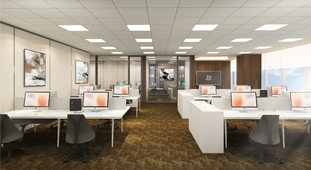 JLK Office Bangkok is a modern corporate workspace that seamlessly blends functionality with sophisticated design. Located in the heart of Bangkok, this office interior features sleek, contemporary aesthetics that cater to the needs of a dynamic business environment. The design emphasizes open, collaborative spaces, alongside private meeting rooms and executive offices, creating a balanced atmosphere that fosters productivity and creativity. High-quality materials, elegant lighting, and ergonomic furniture are used throughout to ensure comfort and style. The use of neutral tones with subtle pops of color, combined with natural elements, enhances the overall ambiance, making JLK Office a professional yet inviting workspace.